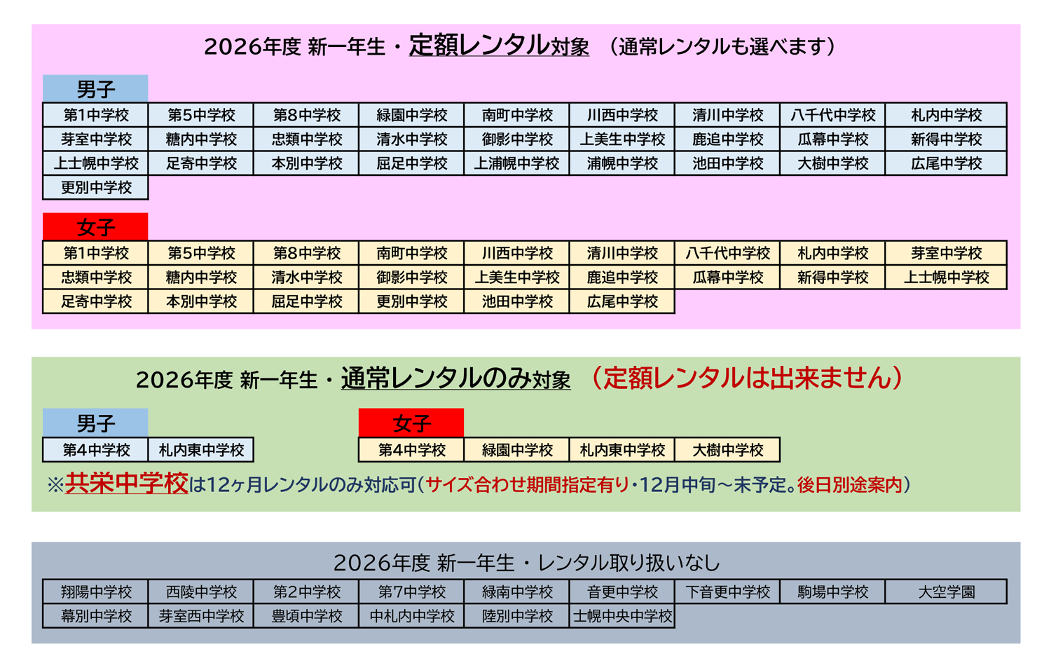 十勝管外で長期レンタルをご希望の方は電話にてご連絡ください。ジャージ通学の北見・小樽エリアの方、大歓迎♪